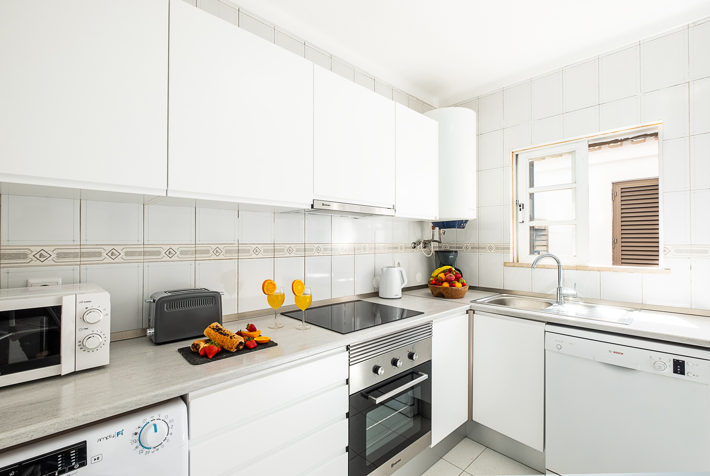 The fully equipped kitchen includes everything needed to prepare meals at home: dishwasher, washing machine, coffee machine, toaster, kettle, microwave, oven, and hob.