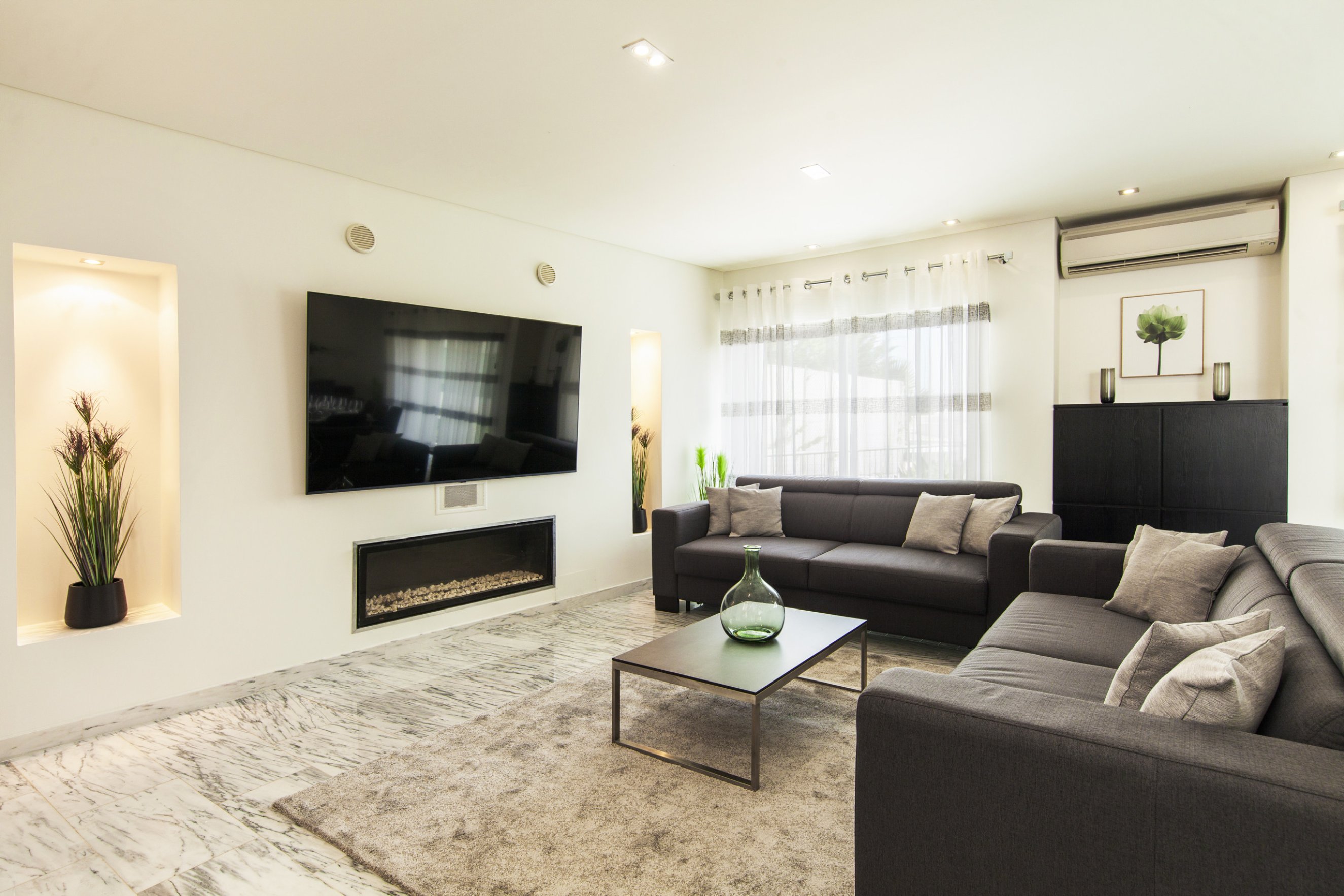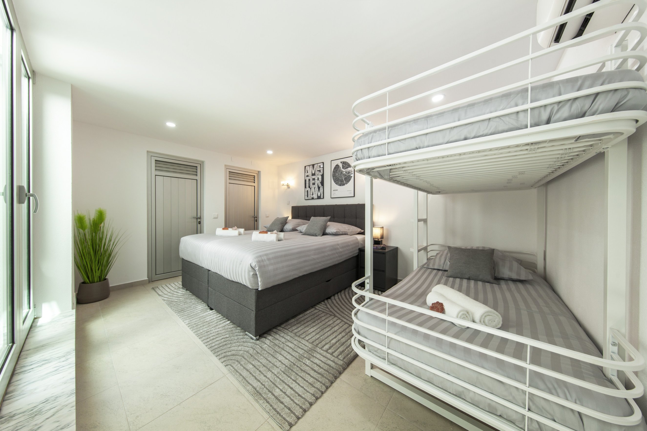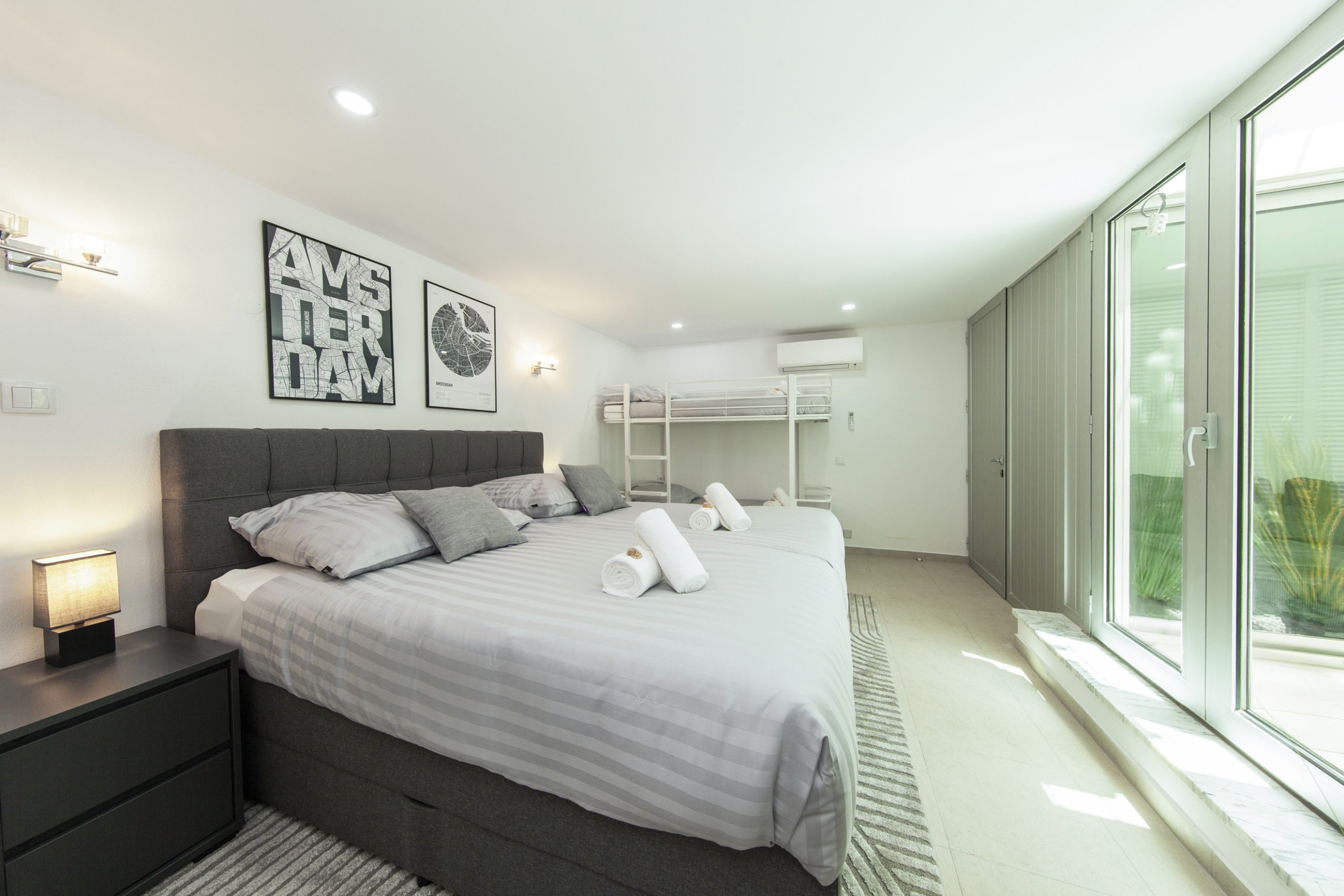 Spread across the ground floor, first floor, and lower level, the villa features 7 bedrooms with various accommodation options, including double beds, bunk beds, and sofa beds – ideal for large families and groups. The bright and spacious living room is furnished with multiple sofas, perfect for socialising and relaxing.
