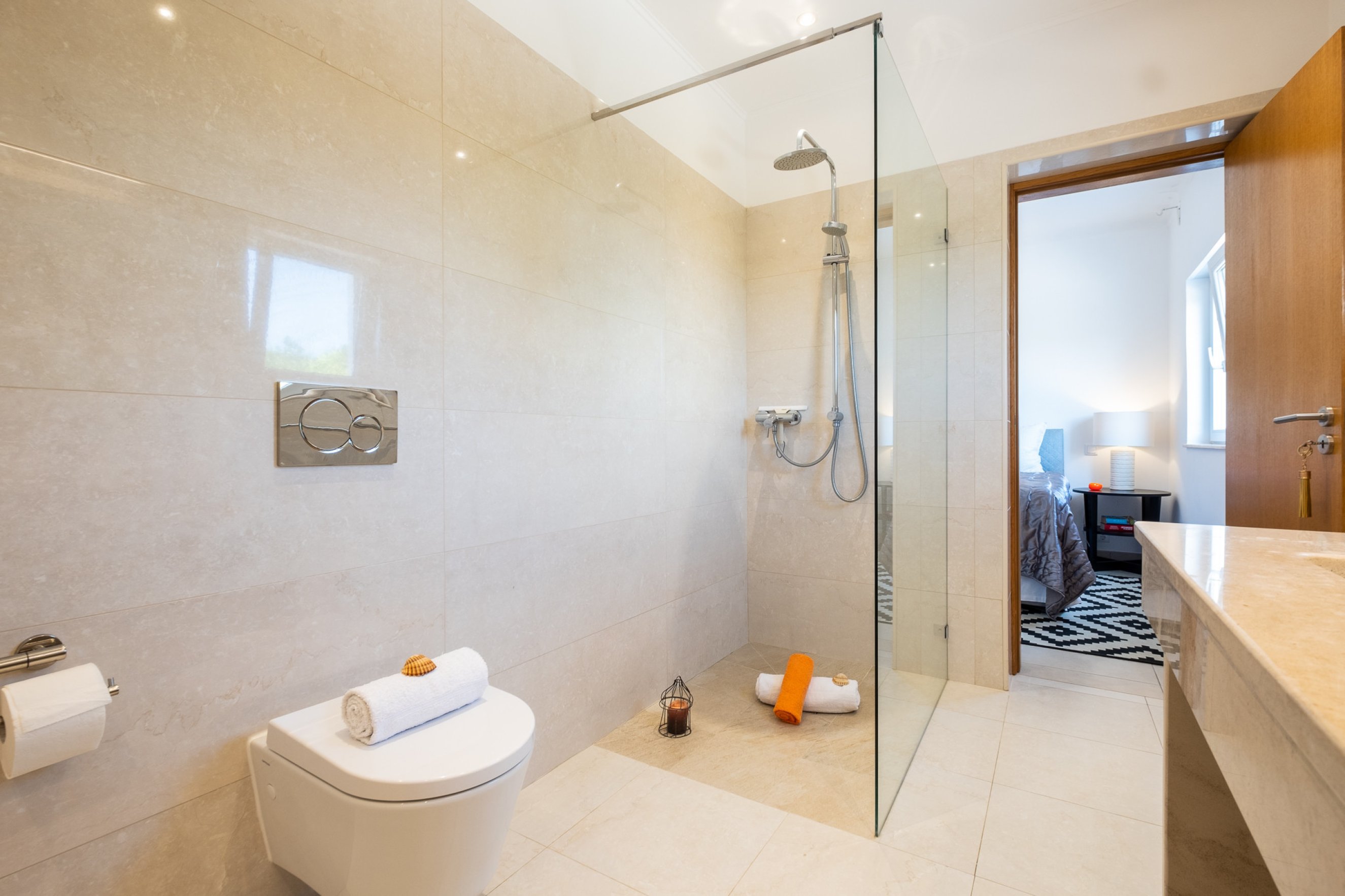 On the ground floor, there are four double bedrooms, three of which are en suite, as well as an additional bathroom, ensuring comfort and privacy for all guests.