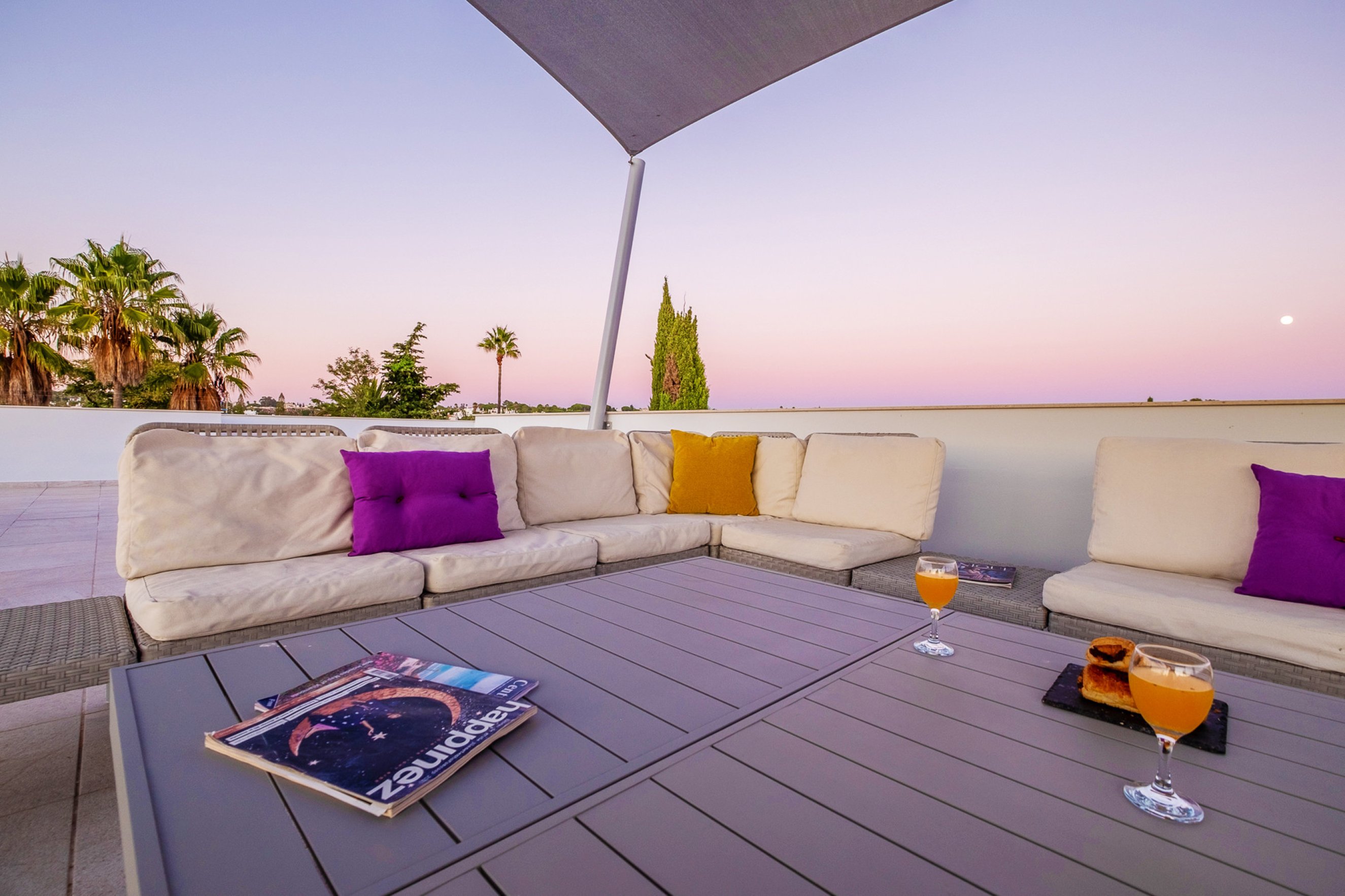 The rooftop terrace, featuring a lounge area, is the ideal spot to unwind and enjoy the sunset.