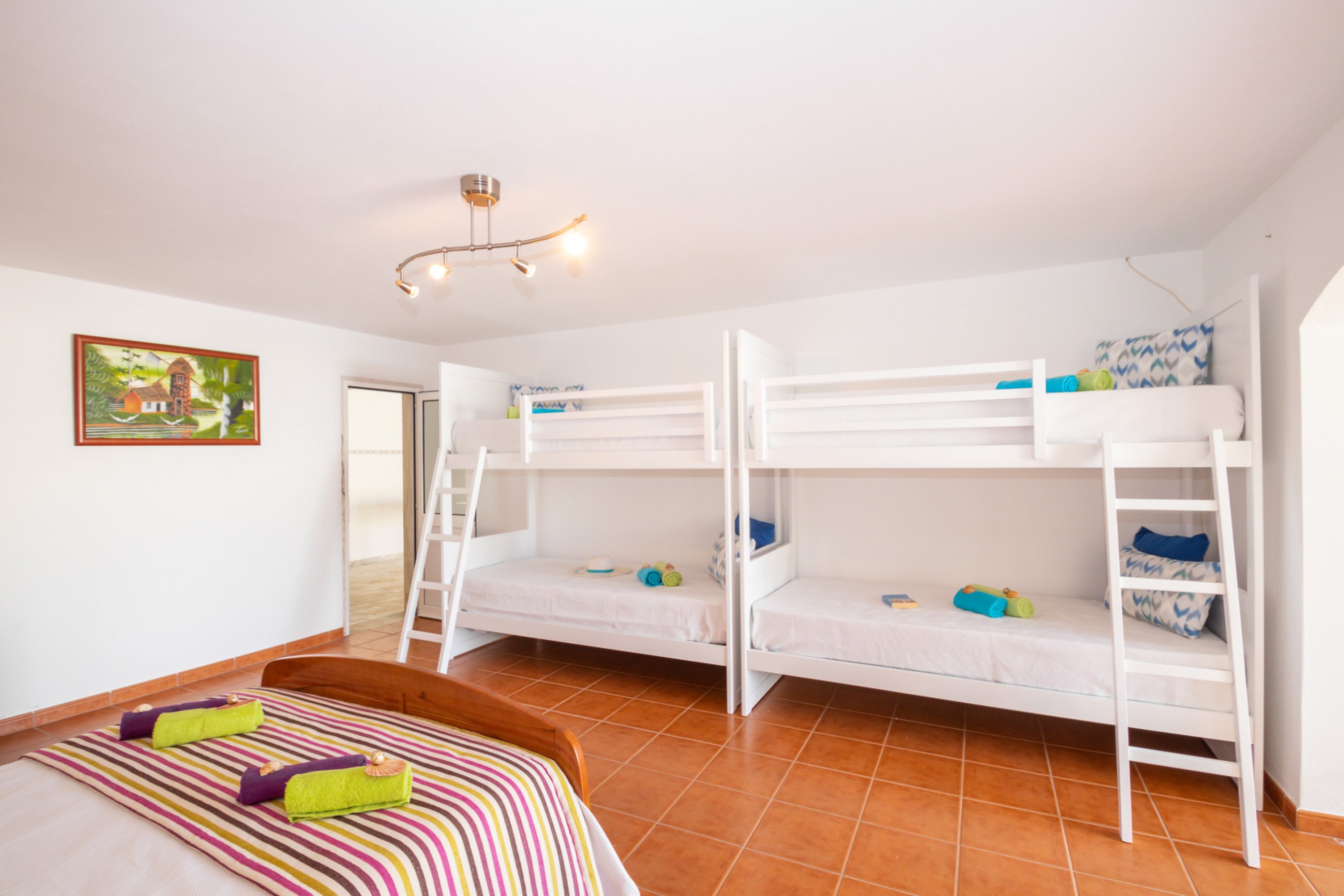The first floor features two en suite bedrooms, each with twin beds, one with a shower and the other with a bathtub, ensuring comfort and privacy for all guests. On the lower level, you’ll find a spacious bedroom with a double bed and two bunk beds, along with a bathroom with bathtub, making it ideal for larger families or groups. This floor also includes a games room equipped with a ping-pong table and table football, guaranteeing fun for all ages.