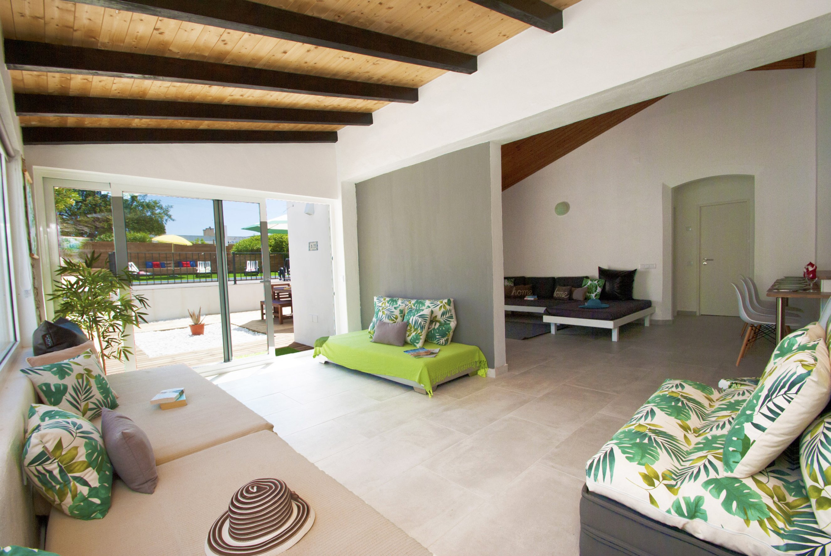 A sala de estar e jantar é acolhedora e convidativa, criando um espaço perfeito para momentos de descanso e convívio após um dia de praia ou passeios, com uma disposição prática que favorece a partilha de experiências.