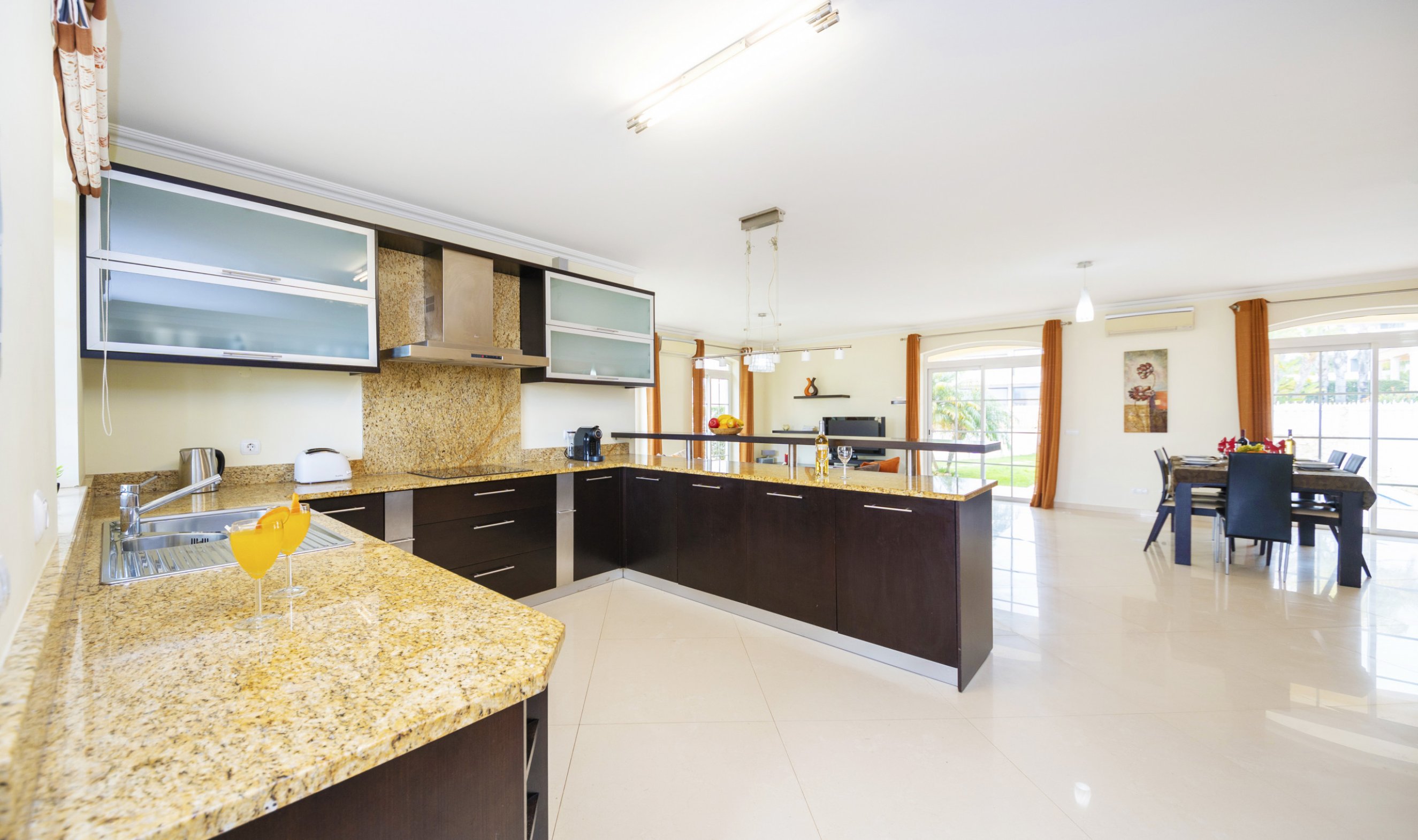 A cozinha é em plano aberto, moderna e totalmente equipada, oferecendo todas as condições para preparar as refeições com comodidade.