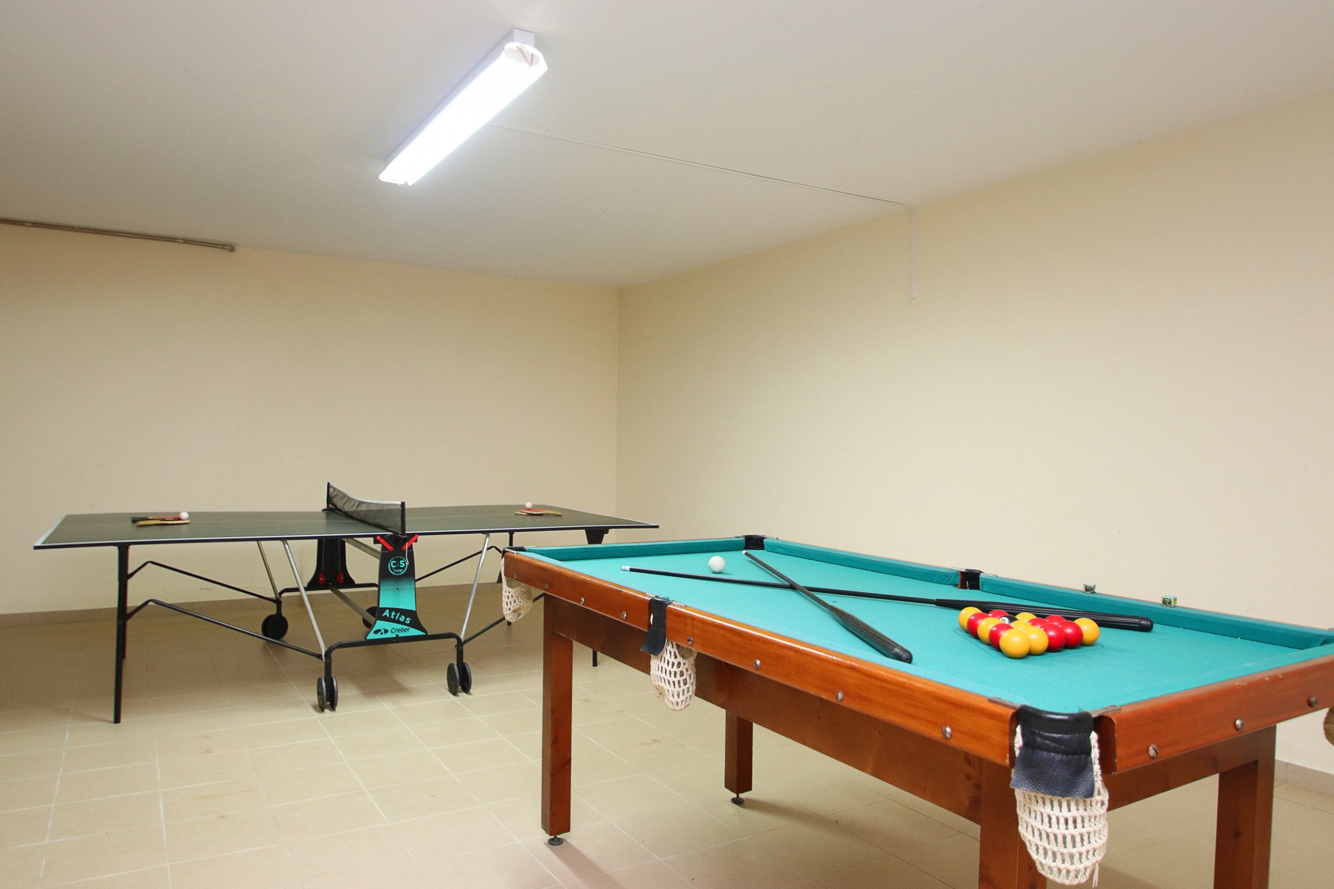 The living and dining area is spacious and bright, tastefully decorated to provide moments of relaxation and socializing. The games room adds extra fun, featuring a snooker table and table tennis, perfect for group entertainment.