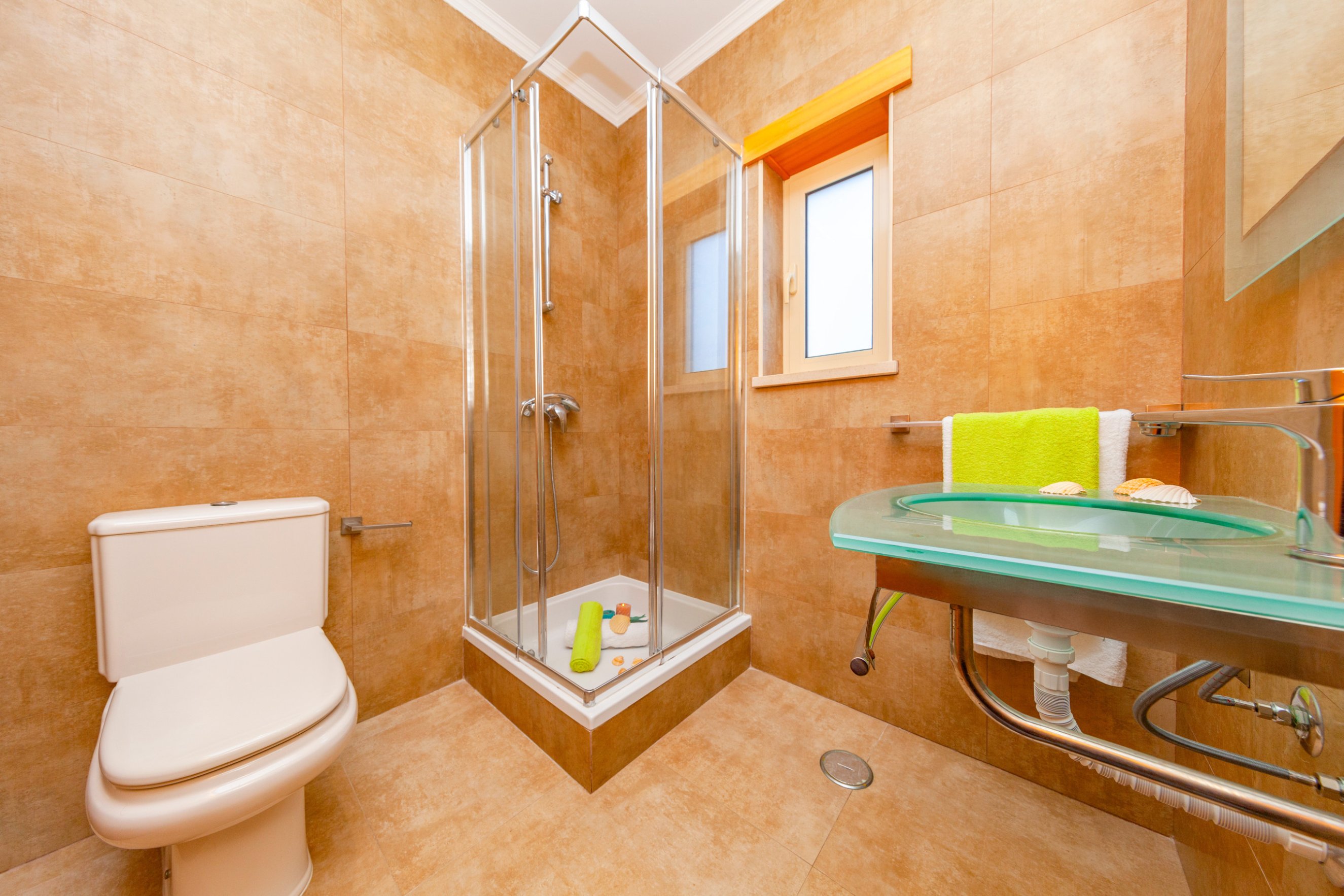 On the ground floor there is a bedroom with two single beds en suite with shower, a bedroom with two single beds, a service bathroom and a bathroom with bathtub.