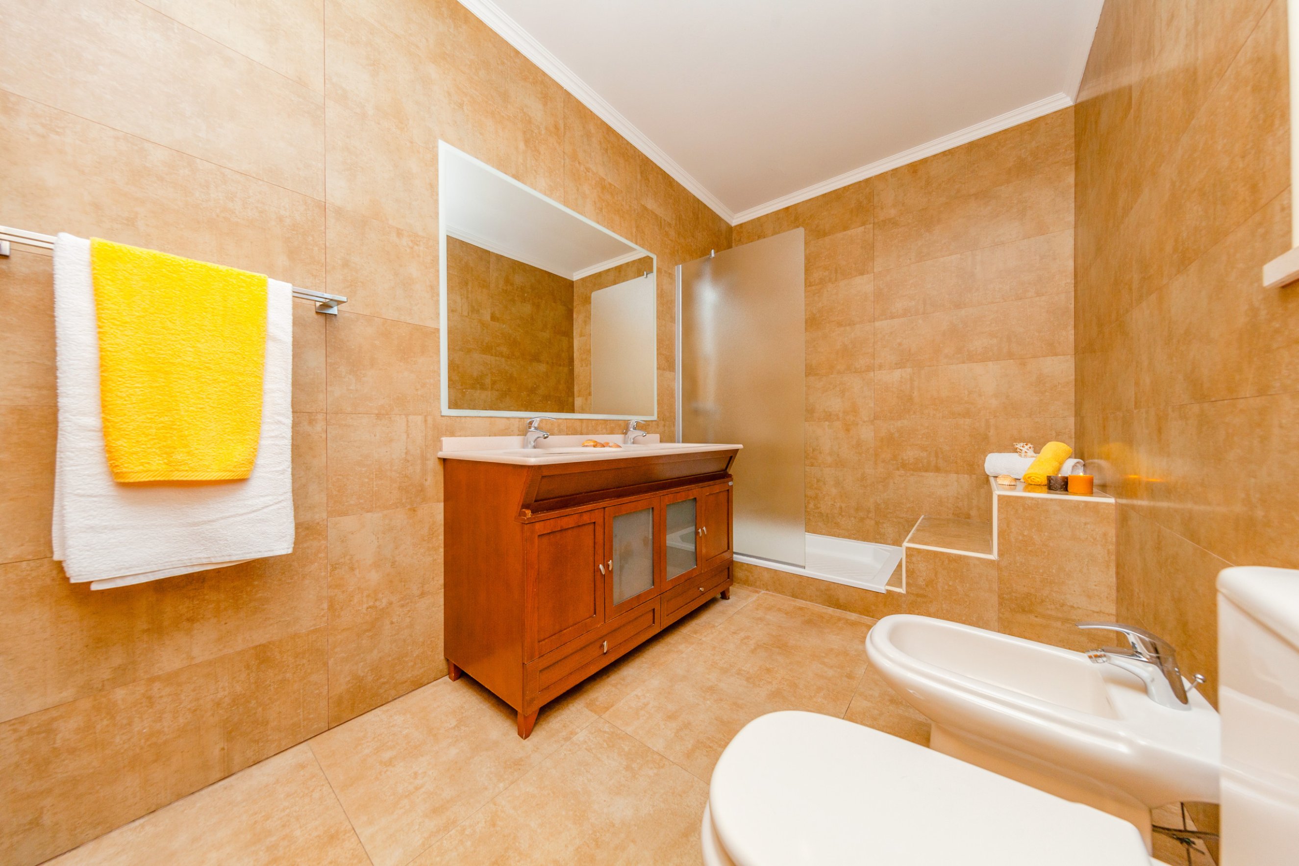 On the first floor there is a bedroom with two single beds en suite with shower and a bedroom with a double bed en suite with shower, ensuring additional comfort and privacy.