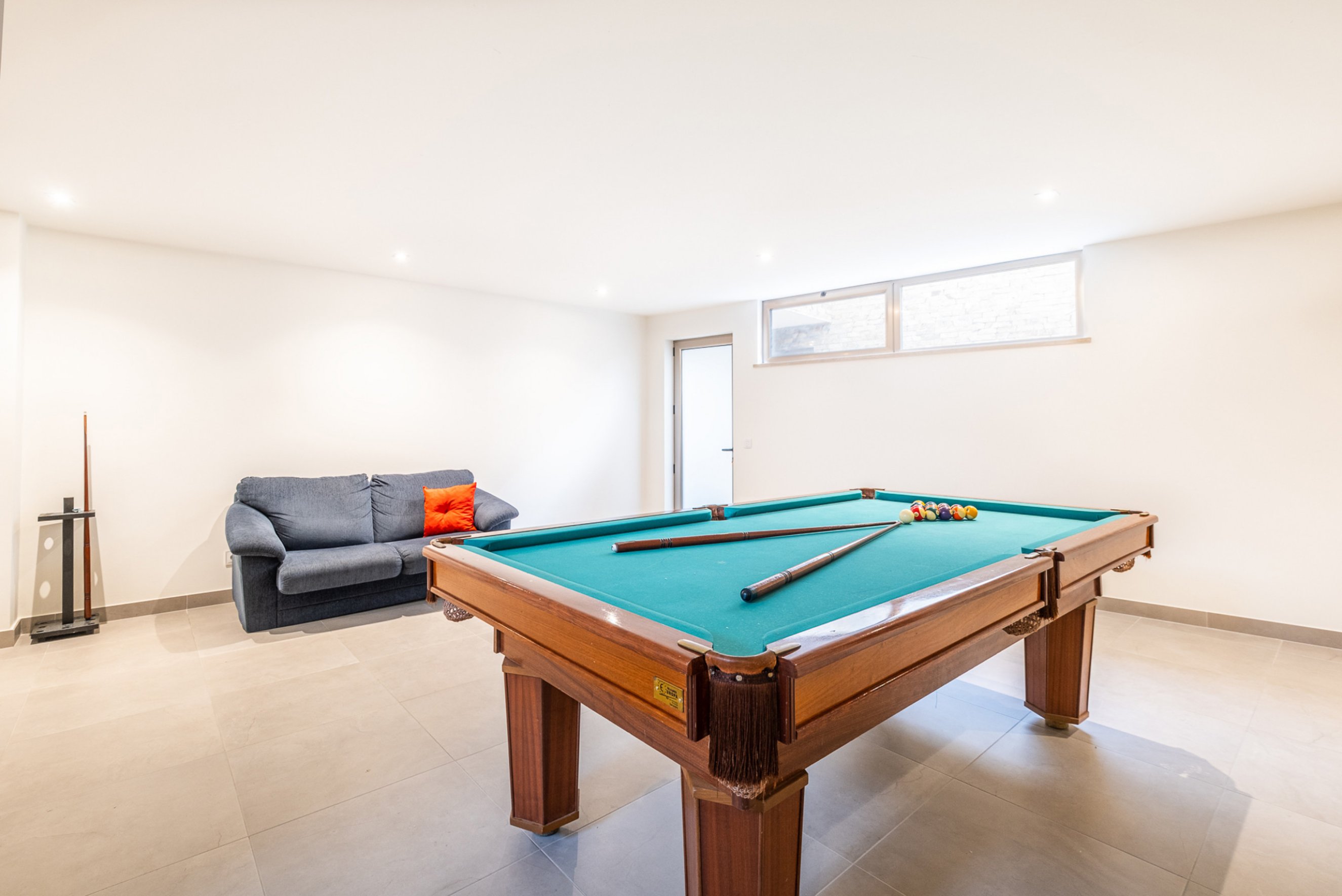 The lower level includes a games room with a pool table and sofa, a bathroom with a bathtub and a convenient laundry room.