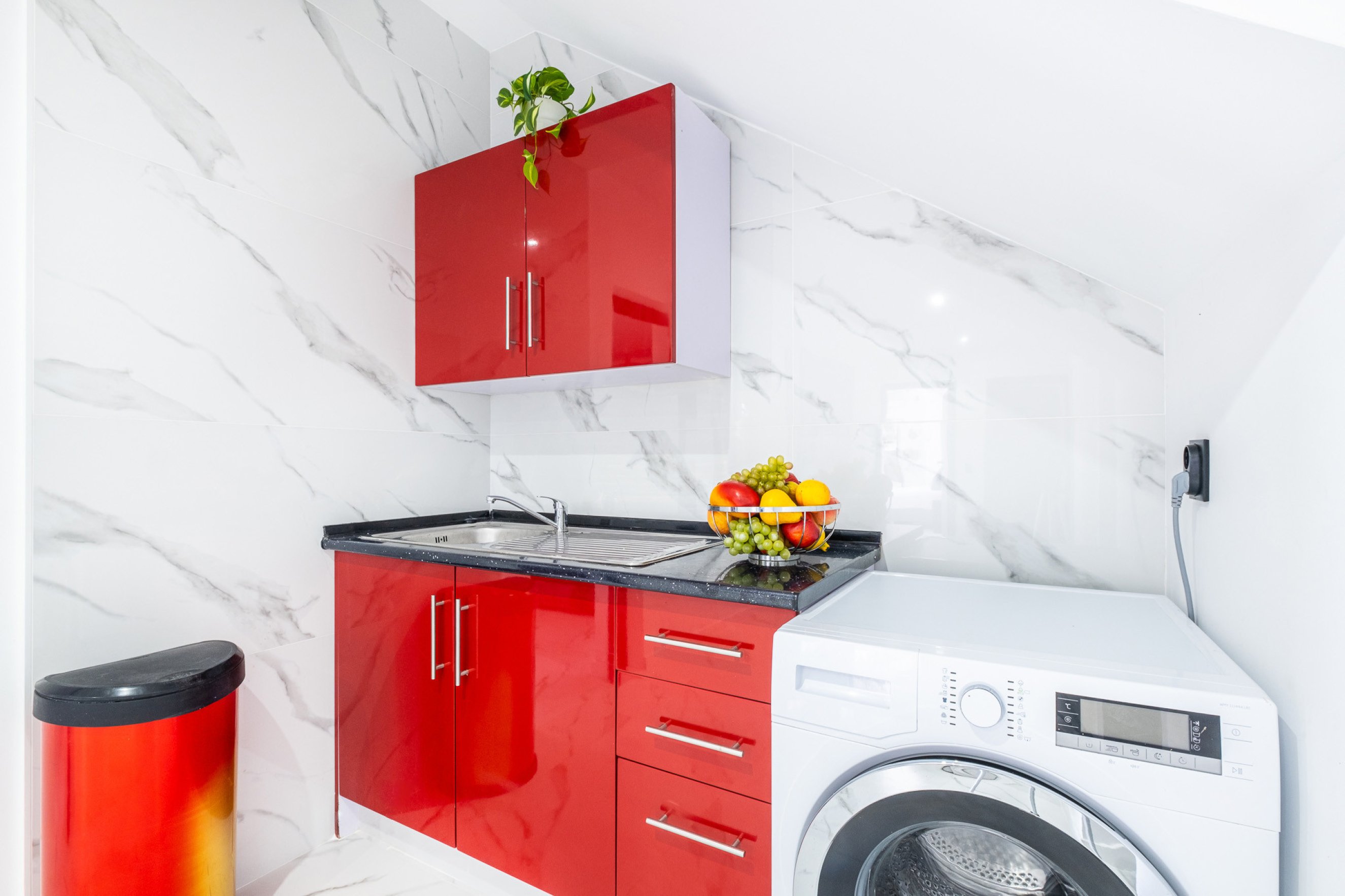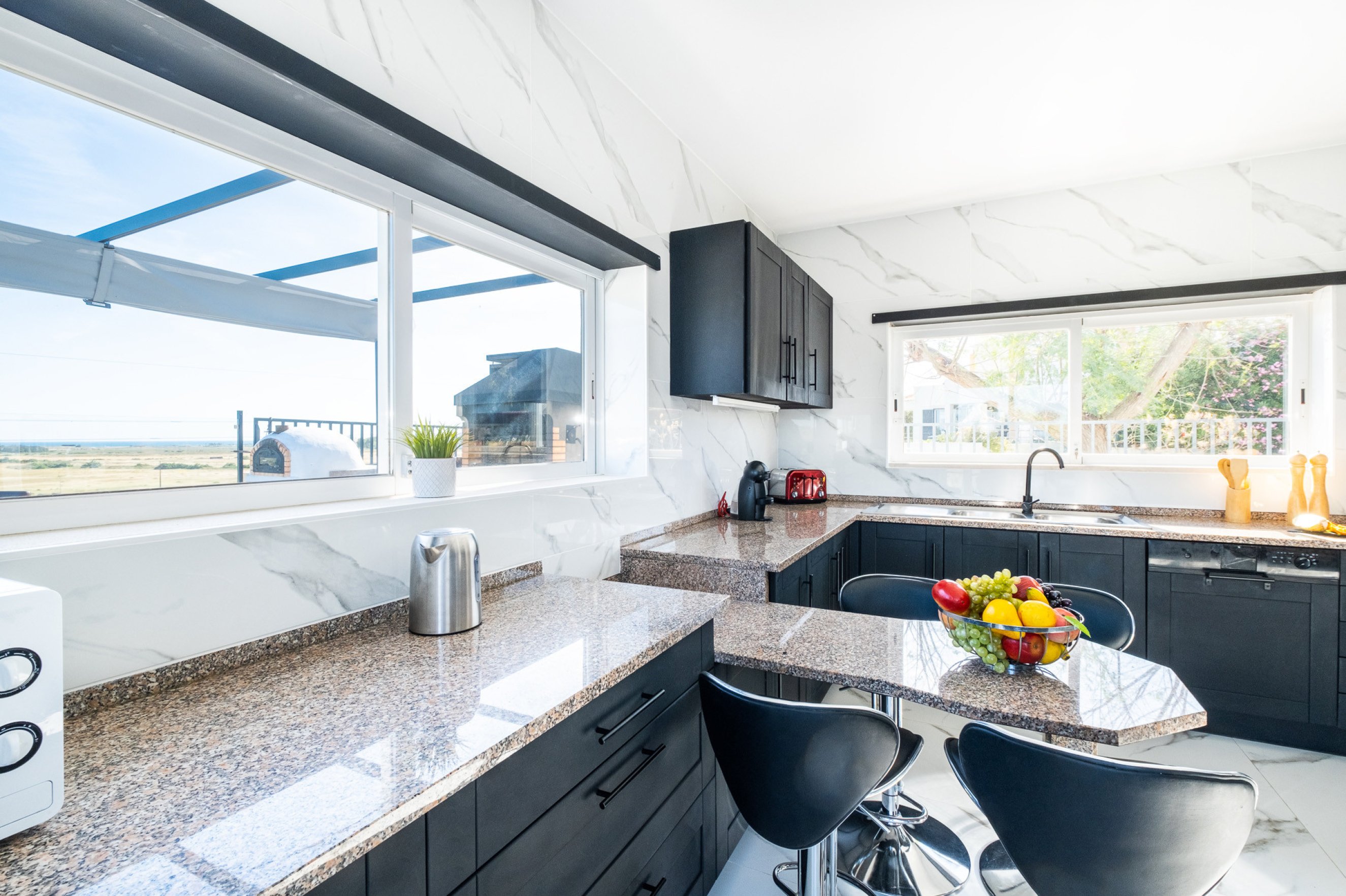 The kitchen is fully equipped and integrates seamlessly with the dining area, providing practicality and functionality for preparing meals during your stay.